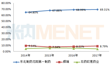 2017年的數(shù)據(jù)看,東北制藥以69.31%的市場份額位居首位,原研廠家輝瑞以8.79%的比例緊接其后。從近幾年各大品牌的市場份額變化看,東北制藥基本呈現(xiàn)穩(wěn)定增長的態(tài)勢,輝瑞的市場份額則有所波動(dòng)。