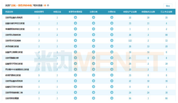 據(jù)米內(nèi)網(wǎng)MED中國藥品審評數(shù)據(jù)庫2.0數(shù)據(jù),截至目前,除了已經(jīng)通過一致性評價(jià)的注射用阿奇霉素,國家藥監(jiān)局還接收到化藥注射劑一致性評價(jià)申報(bào)29個(gè),涉及14個(gè)品種、10家企業(yè)。