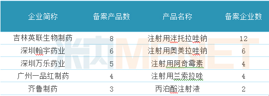 2:注射劑一致性評價(jià)參比制劑備案企業(yè)及產(chǎn)品TOP5