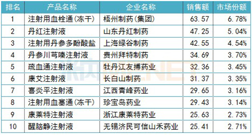 品牌TOP10銷售額均超過25億元,其中,梧州制藥(集團)的注射用血栓通(凍干)、山東丹紅制藥的丹紅注射液等7個是獨家品種。