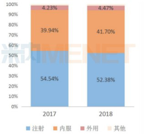 2017-2018年中國公立醫(yī)療機構(gòu)終端總體用藥途徑占比分布