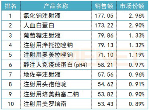 2018年產(chǎn)品TOP10銷售額超過800億元,市場份額合計達14%。產(chǎn)品TOP10中,氯化鈉注射液和人血白蛋白銷售額均超過百億規(guī)模,其余8個產(chǎn)品的銷售額也均超過50億元。
