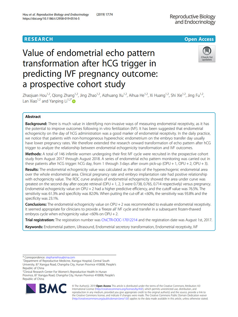 背景:非侵入性測量子宮內(nèi)膜容受性的方法很有價值,因為它有可能改善體外受精(IVF)結(jié)局。有人認為hCG給藥當天的子宮內(nèi)膜回聲是子宮內(nèi)膜容受性的良好標志。在日常實踐中,我們注意到胚胎移植日子宮內(nèi)膜非均質(zhì)高回聲的患者通常妊娠率較低。因此,我們將延伸擴展了hCG觸發(fā)后子宮內(nèi)膜回聲模式轉(zhuǎn)化的研究,以分析子宮內(nèi)膜回聲改變與IVF結(jié)局之間的關(guān)系。